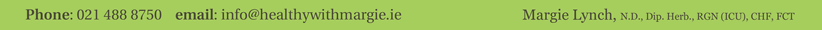 This website is under construction. Please contact Margie using any of the contact details below. Ballinreeshig Nature Farm, Ballygarvan, Cork Contact MargieMargie Lynch, ND, Dip. Herb, RGN ( ICU), CHF, FCT, Ballinreeshig Nature Farm, Ballygarvan, Cork, Ireland |